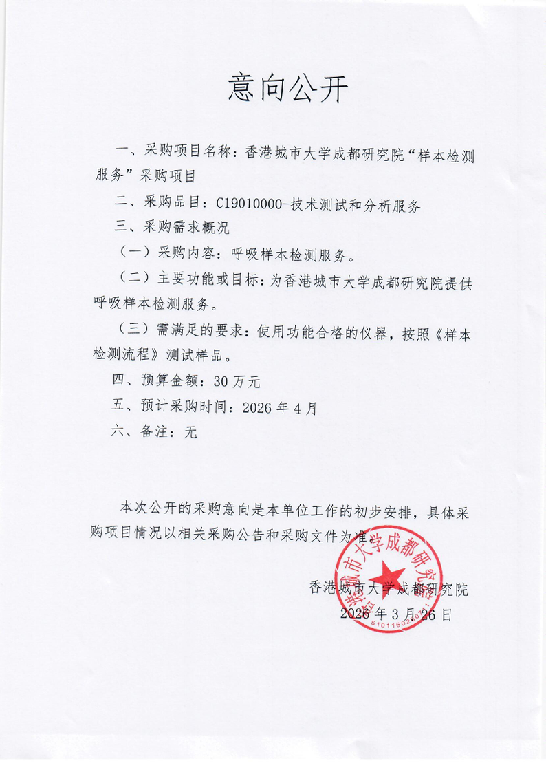 香港城市大学成都研究院“样本检测服务”采购项目意向公开通知